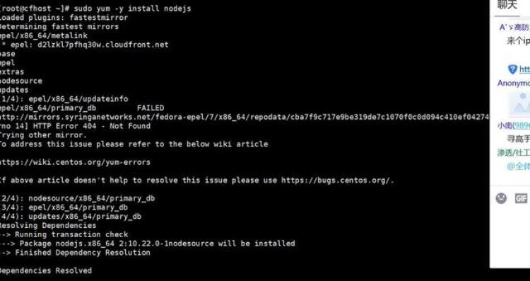 输入命令sudo yum -y install nodejs(命令解释:管理员权限使用yum安装nodejs