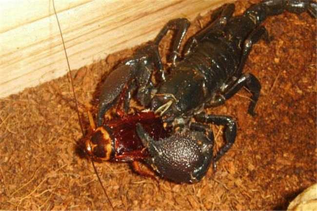 帝王蝎的背部和四肢看起来是黑色的,但它的尾部颜色却不一样,尾部是红色的。用眼睛看帝王蝎的背部是平的,但用顺着它的背部往下摸就会感受到它背部的壳是凹下去的,摸的时候记得戴手套抓住它的尾部再摸。帝王蝎的眼睛不仔细看是看不到的,它眼睛在它双钳旁边,主要用于观察上方的位置,所以看帝王蝎走路的时候可以看到它的钳子是往上举着走的。帝王蟹除了个头要比普通蝎子大以外,它的其他部分和普通蝎子看起来没什么不一样的。