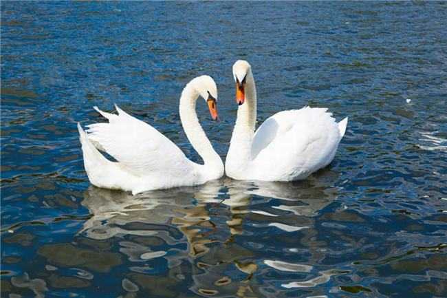 天鹅求偶的时候会把脖子轻轻的贴上对方,然后弯下脖子会摆成一个爱心的形状。它们的一生也会终身相伴。