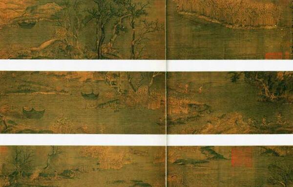 《江行初雪图》,五代名家赵干绘画真迹,李后主题字,全卷描写长江沿岸渔村初雪情景。图前题“江行初雪,画院学生赵干状”,应是南唐后主李煜的笔迹,另有宋宣和、金明昌、元天历、清乾隆、嘉庆诸印,以及柯九思,吴瑞,梁清标,安岐诸收藏印,价值非凡,在台北故宫十大稀世珍宝中暂排第五位。