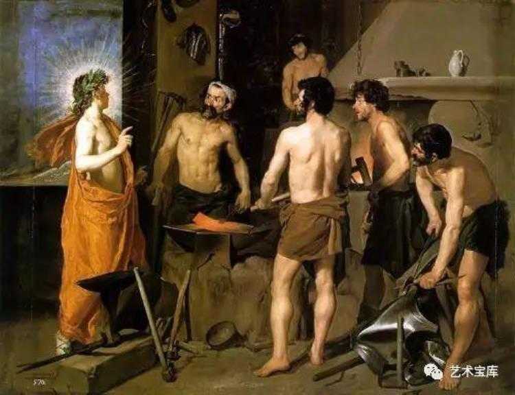 《火神的锻铁场》(1630)画面主要表现的内容是:太阳神阿波罗进火神伏尔甘的锻铁坊,并告诉他,他的妻子维纳斯正和别人私通。火听后,惊愕地愣住了,他的助手也个个惊讶诧异,大家都被这一消息惊停住了手上的活。这里,神话题材显然被完全世俗化了,除了头上有圣的阿波罗,其余的人均和真实的打铁汉没什么两样,倒具有更多的人性和生活情趣,体现了委拉斯开兹艺术的一贯特色。