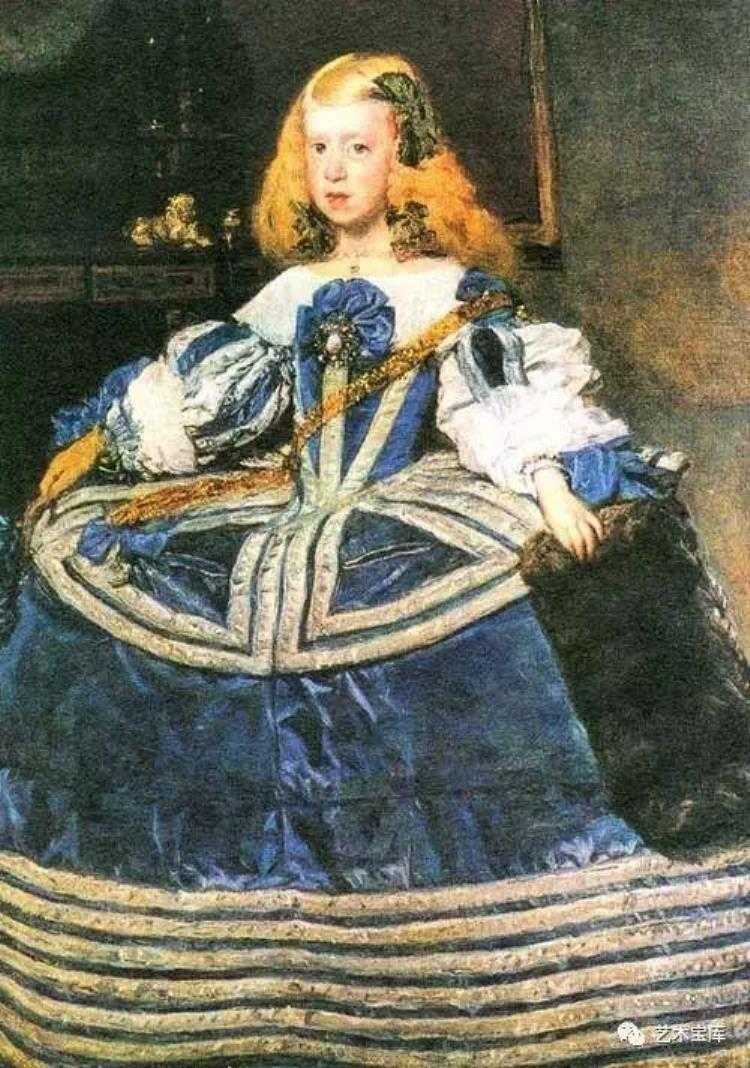 《玛格丽特公主肖像》:小公主玛格丽特已经八岁了。三年的时间,让玛格丽特原本无忧无虑的天真神态,转而散发出成熟尊贵的气息,脸上还多了一股忧郁气质。小公主披着一头金发,身着蓝色系礼服,头戴绿色的发结,画中的皮手套、纺织品、长裙褶边和饰带等,都有助于加强小公主的整体效果。小公主细致、吹弹可破的肌肤,也是委拉斯贵支精心刻画的杰作。就像委拉斯贵支所有的皇室肖像画一样,这幅画里的人物表情深具个性,局部描绘细腻、华丽,向我们展示了贵族雍容华贵、高尚优雅的姿态。