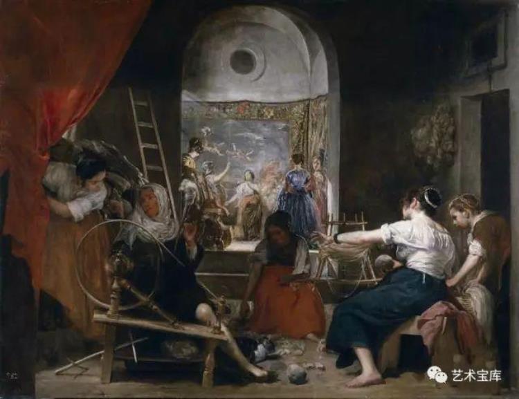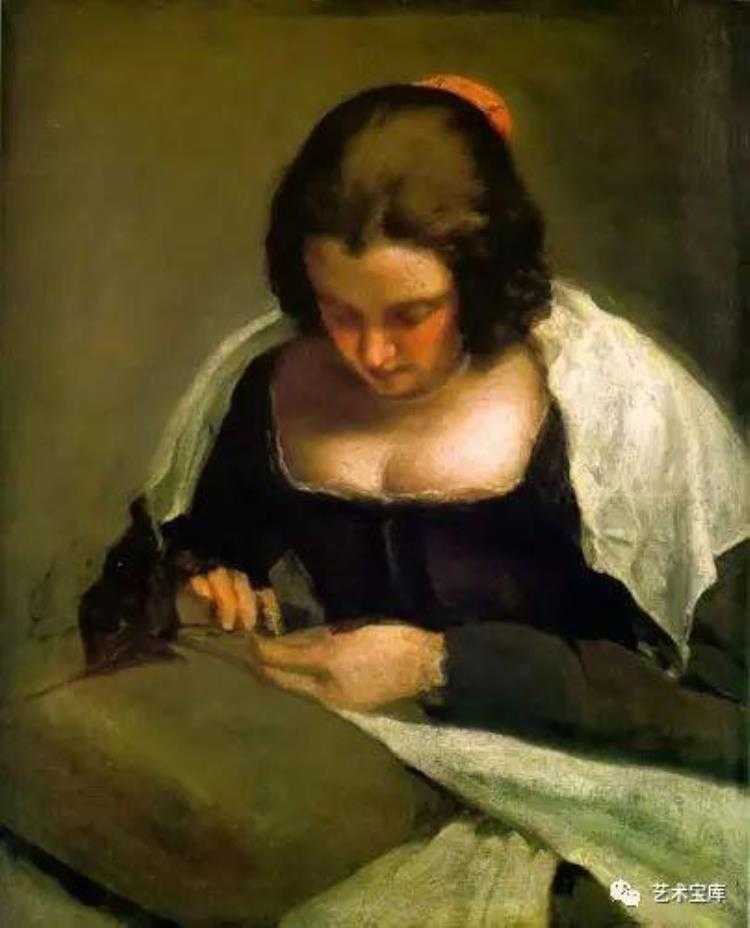 委拉斯开兹的绘画反映社会生活时非常客观,在许多描绘社会底层大众的画面上,既不赞美贫穷的圣洁,也不鄙视。他只把自己看到的如实地描绘在画布上罢了。《纺纱女》1640是他直接描绘纺纱女工的作品。