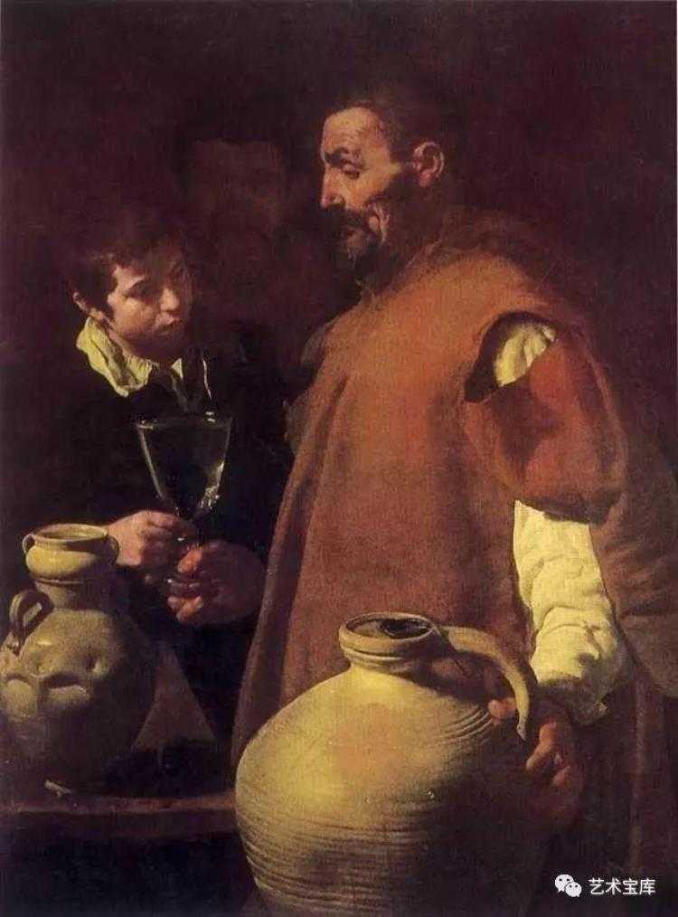《卖水的老人》(约1619)是画家早期的一幅具有典型意义的作品,表明了他对人物性格的努力探索。画中执杯酣饮者,显然是塞维利亚街头的普通人民。画家以特写的形式表现出这位塞维利亚卖水的老人严肃、粗犷的性格特征。老人和买水的小孩构成了主从关系。老人的外衣已经破烂,他左手搭在陶翁上,右手把一只装水的玻璃杯递给小孩。物体的明暗部分富有层次。尽管画家竭力赋予这些普通人以内在的力量,老人的脸上表情欠丰富。画上的土黄、淡紫两色很浓厚。