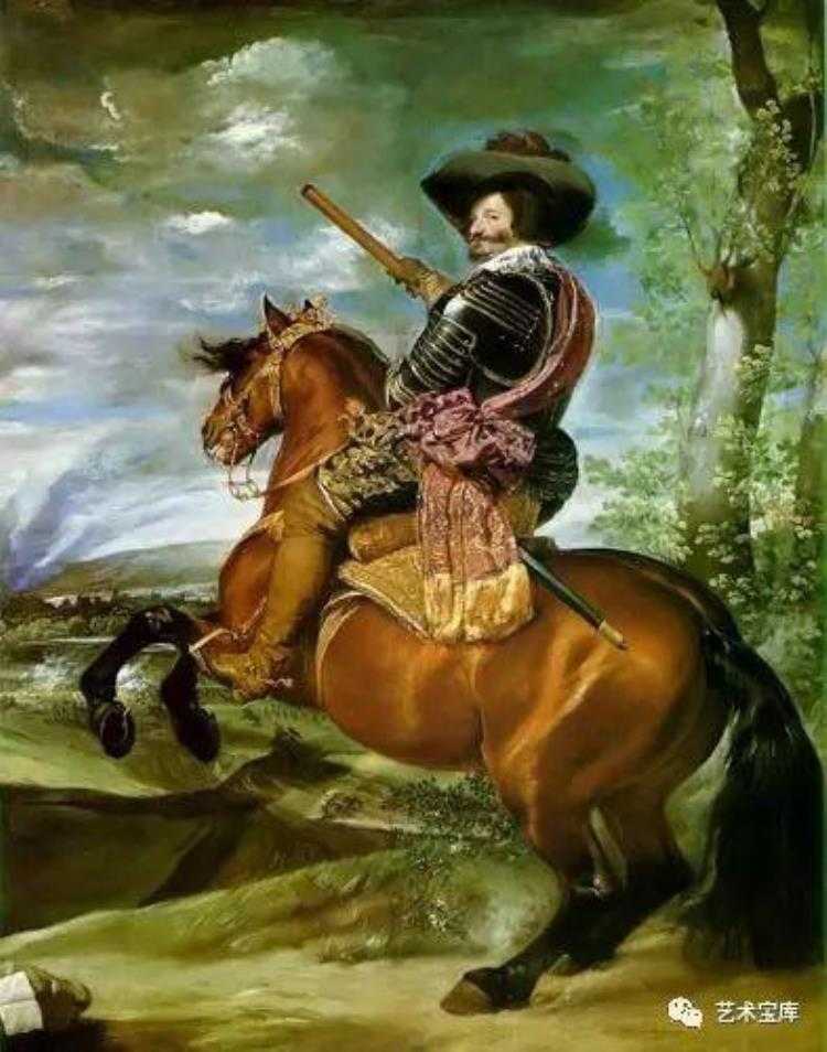 《菲利普四世骑马像》委拉斯开兹最好的一幅作品。画家从1628年开始动笔,一直到1634年或1635年才完成。在画中,马的姿势非常高贵,犹如马中贵族,显示出一副被腓力四世调教得很好的样子。画面右边的小风景,就像要抬高国王与马一样,颇有居高临下之意。从植物及小山的造型来看,好像是位于勃拉多地区的风景。但画中真正的主角是腓力四世的脚,它与马后脚一样有动态感。