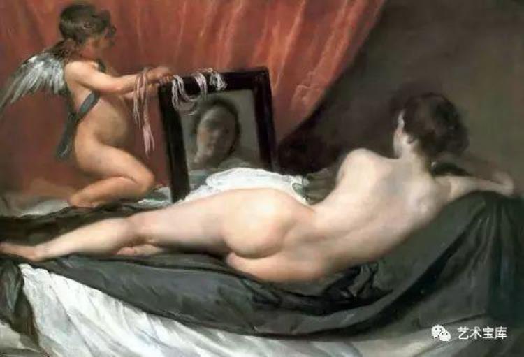 维纳斯是画家最爱描绘的女神,画家往往借女神形象表达自己的审美理想。不同民族、不同画家塑造的维纳斯是不相同的。威尼斯画家笔下的维纳斯丰艳多姿、典雅庄重;鲁本斯创造的维纳斯搔首弄姿、坚实有力;而委拉斯开兹这幅维纳斯却娇小玲珑、端庄、高贵,她的优美无与伦比,表现了西班牙人的审美观念。