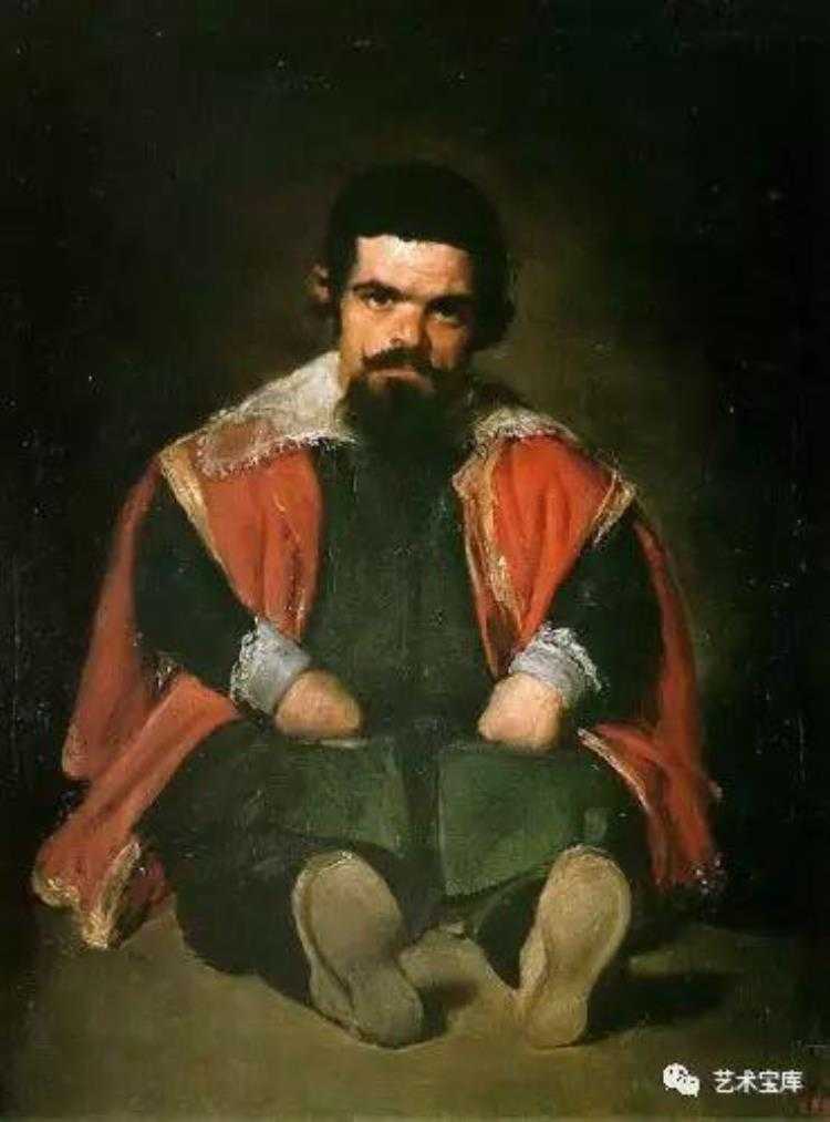 在1633—1648年间,委拉斯贵支还创作了一组宫廷丑角和侏儒的肖像。这些作品有《埃里·波波·德里·科林》(1648)等。画家在这些作品中主要强调的不是他们生理上的缺陷,而是他们的悲惨命运。
