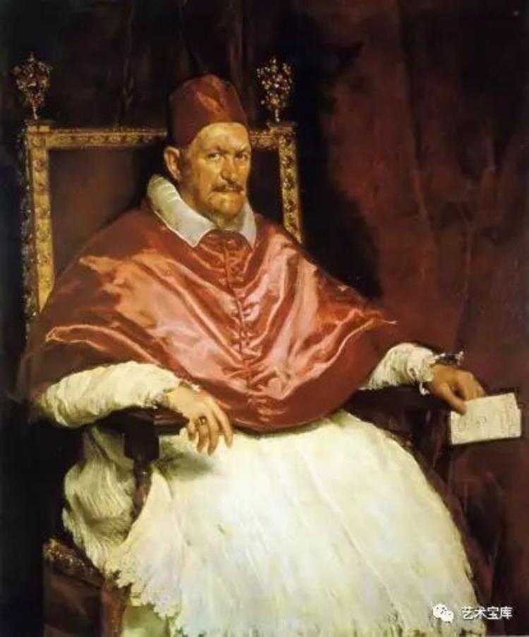 1649年,委拉斯贵支第二次去意大利,在那里他完成了另一幅著名的肖像画《教皇英诺森十世肖像》(1650)。在这幅肖像中,画家既表现了这个人凶狠、狡猾又精神虚弱的一面。画面上,火热的红色调子表现了特有的宗教的庄严气氛,白色的法衣和红色的披肩形成了诱人的色调的对比,笔触显得十分自由,表现了艺术家的高超技巧。当这幅肖像送给教皇时,教皇惊讶而又不安地说了这样一句话:“过分象了。”俄国画家苏里柯夫对此画极为推崇:“这一切都很完美,技巧、形式、色调每一部分都使人惊奇——这是一个活的人,这是所有过去绘画中高于一切的绘画。”同时代观众对其作品的评价:“所有其他的作品都是绘画,只有这一幅才是真实的。”