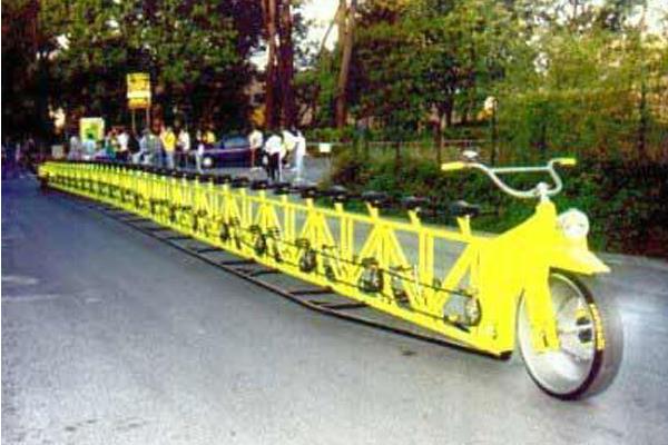 这款自行车和世界上最长的摩托车有得一拼,荷兰人米基尔在2011年的时候打造了这辆世界上最长的自行车,虽然只有两个轮子,但是上面的座椅几乎一望无际,全长可达35.7米,不过骑起来也非常困难,只能一前一后两个人发力。