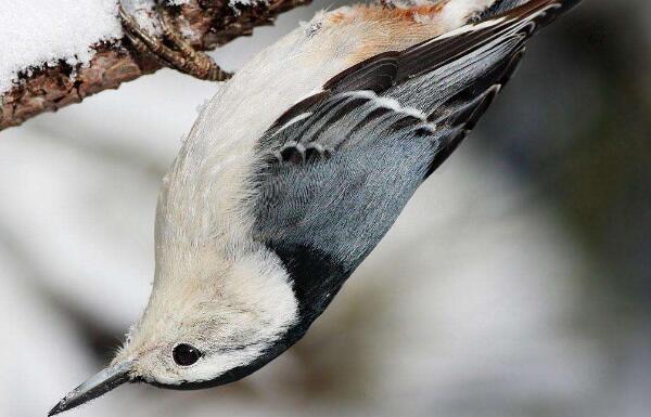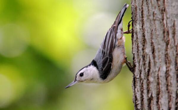 白胸鳾(shī)是一种小型鸣禽,也是一种小型燕雀,它体长约15.5厘米,脚短爪硬,很善于攀援在树木上,经常倒站在树干上,而且能头部向下,甚至身体向下爬树,它也是目前世界上唯一能头向下尾朝上往下爬树的鸟类,看着它爬树的样子,真的让人感觉不到地球引力的存在!