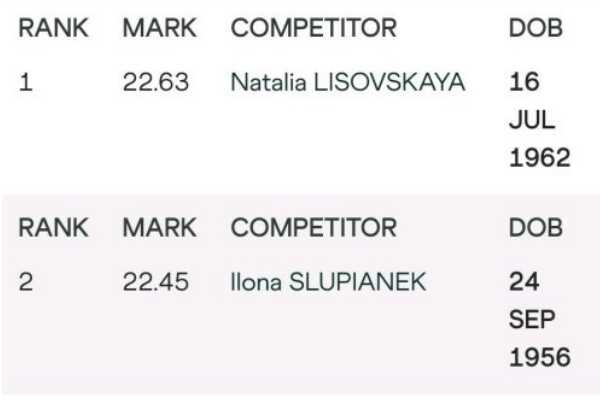 但菲宾格洛娃并没有能够一直保持下去,毕竟运动员的巅峰状态会随着年龄逐渐消退,而新兴小将纳塔丽亚·里索斯卡娅开始发力,在1984年凭借着22米53的好成绩一举刷新了菲宾格洛娃的纪录,之后更是连续两次再次刷新,最终以22米63的杰出成绩成为了女子室外铅球世界纪录的保持者。