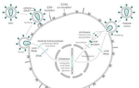 现在艾滋病的治疗方法主要是采用艾滋病毒三种酶的抑制剂来进行治疗。这三种酶分别是逆转录酶(reverse transcriptase),蛋白酶(protease)和整合酶(integrase),它们是艾滋病毒复制过程中不可缺少的重要工具(见下图)。如果用相应的抑制剂针对它们,则艾滋病毒的复制会受到抑制或被终止,所以新的病毒不会产生,旧的病毒也不复存在,从而达到治疗目的。