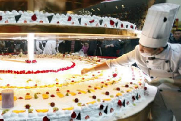 而制作这个超大号蛋糕也需要耗费大量的资金和材料,当时单单是调配制作蛋糕底胚就耗费了足足500公斤的鸡蛋和260公斤的面粉,这还不包括蛋糕胚上的数百公斤的奶油和水果块等,并且在蛋糕的周围还精心的装饰上了一条巨大的飞龙,看起来简直壮观又霸气。