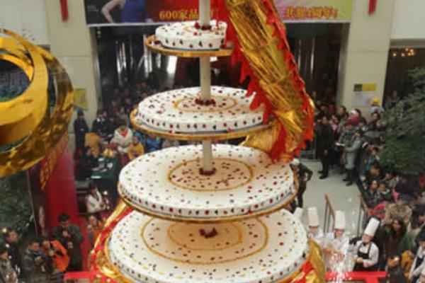 这座世界上最高的蛋糕就诞生于我国河南省洛阳市的一家卖场中,当时为了庆祝周年纪念日,于是主办方邀请了二十多位厨师来协力制作这个超大号蛋糕,据说制作过程非常艰难和漫长,整整持续了三天才顺利完成,一举打破了法国在2010年创下的7.8米高世界之最记录。