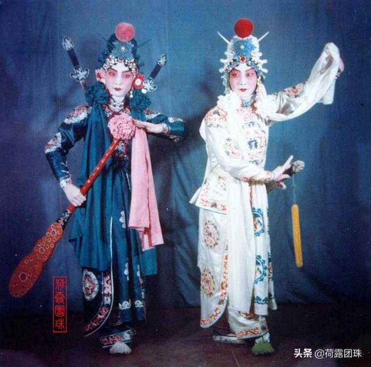 当然,白蛇青蛇的头面冠戴,也有一个演化过程,据说清朝演这出戏的时候,戴的也不是大额子,是渔婆罩,后来也不知道是哪位艺人给改成了戴大额子,后来梅兰芳考虑到,毕竟青白二蛇也只是妖精,不是女将,这样穿戴也似乎不妥,于是逐渐就改为戴软额子面牌上加红色大绒球,如此慢慢就固定下来,逐渐接近今天青白二蛇的扮相,当然个流派之间还有细微区别,这个以后有机会在细谈。