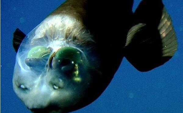 上面的生物就是太平洋桶眼鱼,其头颅完全透明,这使得它的双眼能看到四面八方(前面的那两点不是眼睛),这也算是一种世界最奇怪的海洋生物吧!