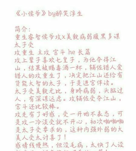 重生睿智侯爷攻x美貌病弱腹黑多谋太子受,一般不看重生文的,但这篇真心良心重生,既不做作又不夸张,文笔很好,感觉有点像《倾尽天下,乱世繁华》的套路。说到这个就想哭,方君乾肖倾宇阿羽的最爱呀!当初看这个是哭着看完的!如果你爱看小说,就看看吧,如果你是腐女,你就必须得看!真的!你不看我就得和你谈谈人生了!