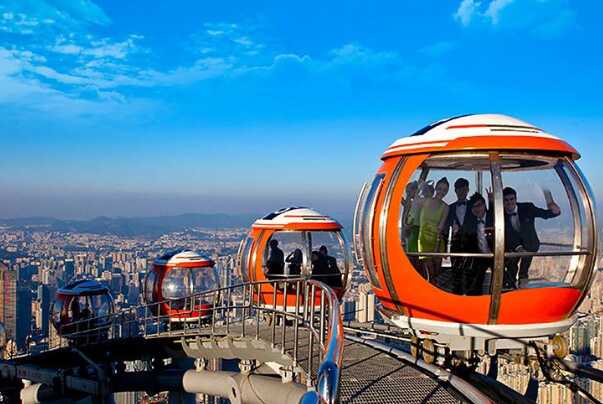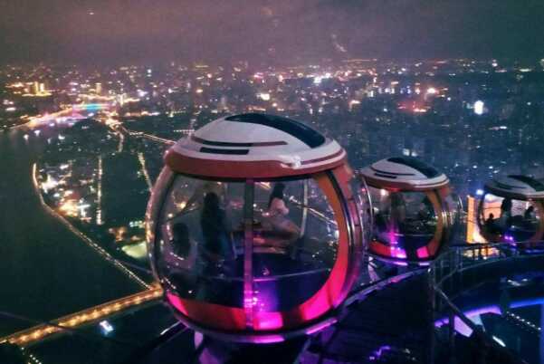 广州塔摩天轮位于广州塔的塔顶处,是世界上最高的摩天轮,高达450-454米,总共由16个观光球舱组成,每个球舱直径在3.2米,一个球舱可容纳4-6名乘客,一次性可以乘坐百名乘客。这个世界三大摩天轮之一的广州塔摩天轮转一圈需要20分钟,在这期间,游客可以多角度观察广州市的美景,气势恢宏。这是国内第一高摩天轮,虽然高,但是安全性也高,据悉,广州塔摩天轮可以抵抗8级地震以及12级的台风。