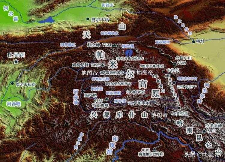 瓦罕走廊以北,帕米尔高原的山峰直插天际,南边兴都库什山脉陡峭险峻,双峰耸立,中间是缓缓流淌的瓦罕河。瓦罕河和帕米尔河汇流后称为喷赤河,再与瓦赫什河后称阿姆河,从阿姆河盆地(吐火罗盆地)流出,流经卡拉库姆沙漠和克孜勒库姆沙漠,最终注入咸海。阿姆河大部分河水来自帕米尔高原(葱岭),平均水量约2525立方米/秒,全长约2620千米,是中亚水量最大、流程最长的一条河,流经塔吉克、阿富汗、乌兹别克、土库曼四个国家。