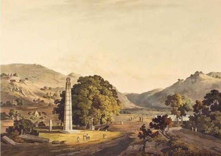 阿克苏姆的方尖碑。 丹尼尔·哈维尔(Daniel Havell),从圣赫勒拿岛、开普敦、印度、锡兰,红海、埃及等拍摄的二十四幅景观之一,手工上色的水彩画,1809年
