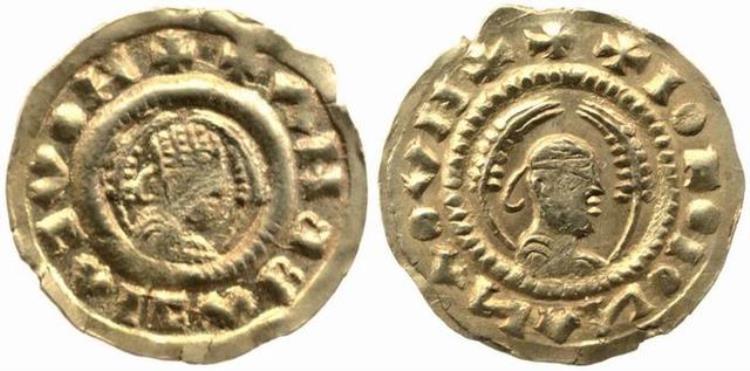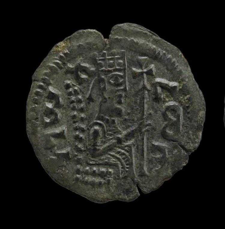 硬币正面显示阿克苏姆国王登基时手持十字勋章并佩戴精美皇冠,约600–630年