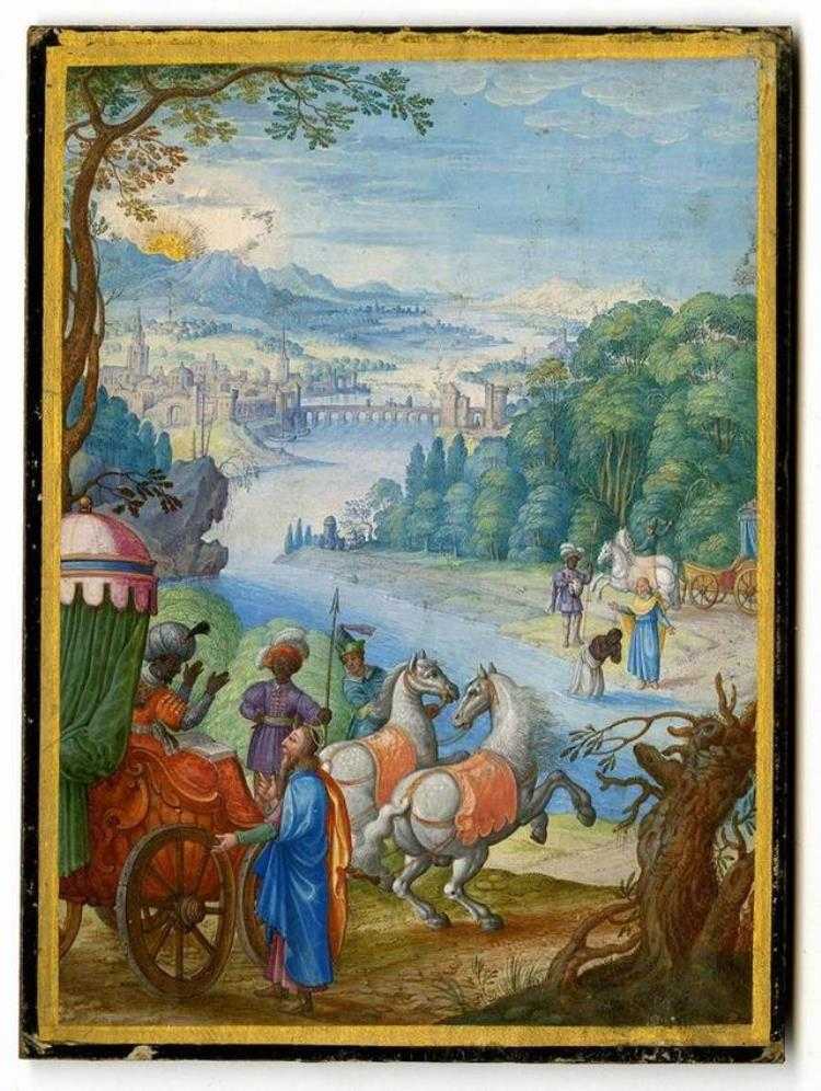 一位匿名艺术家绘制了圣菲利普为埃塞俄比亚内侍施洗的情景,牛皮纸上色,约1615年至1635年