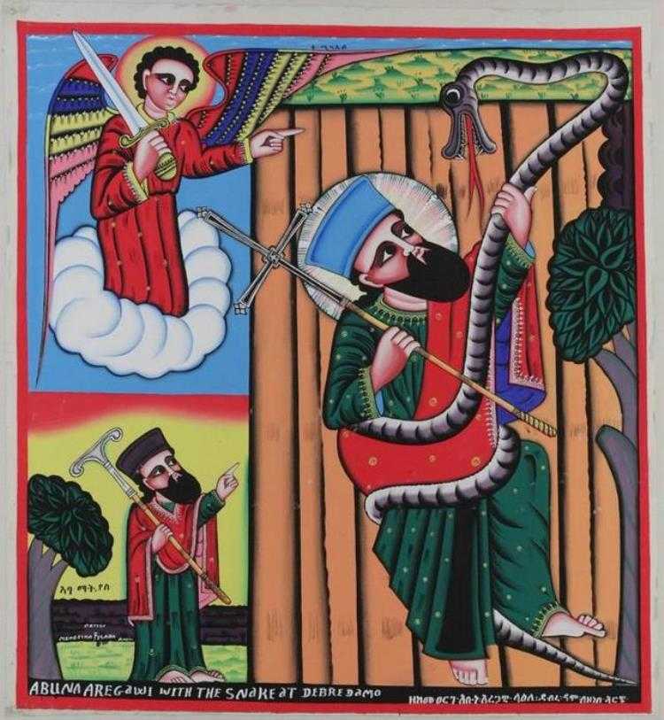 Mengesha Fiseha在棉布上创作,显示阿布纳·阿雷加维被蛇拉到达布拉·丹莫顶部,埃塞俄比亚,2007-2008年