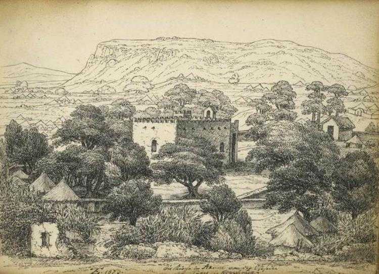 爱德华·赞德(Eduard Zander,1813-1868),在速写本上记录埃塞俄比亚的风景和人物,并绘制了阿克苏姆大教堂的景色。 钢笔和黑色墨水,1853年。