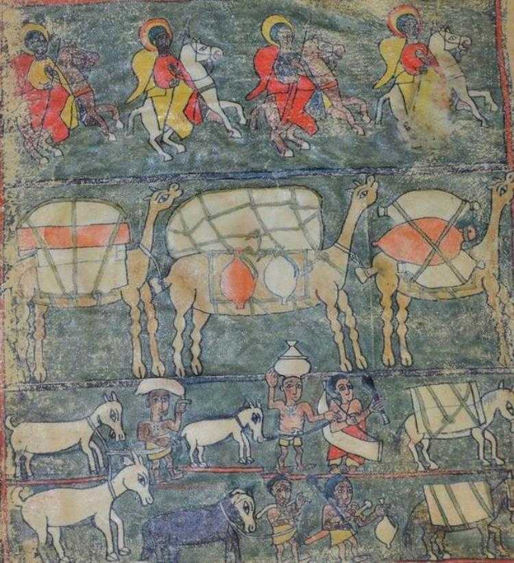 15世纪或16世纪初,埃塞俄比亚手稿中描绘运输行李的方式。