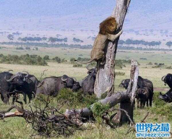 我们可以看到其他一种都是名声赫赫的存在,而非洲水牛在这中间似乎是非常尴尬的位置,但是你完全想不到,就是你认为最普通,最差劲的非洲水牛,却是当中最恐怖的存在。根据记录者发现,在草原上经常会出现非洲水牛杀死雄狮的情况,有人员在肯尼亚马赛马拉保护区,还拍摄到丛林之王狮子在草原上被一群愤怒的非洲水牛追赶,后来狮子还不惜放弃尊严爬到树上去躲避。