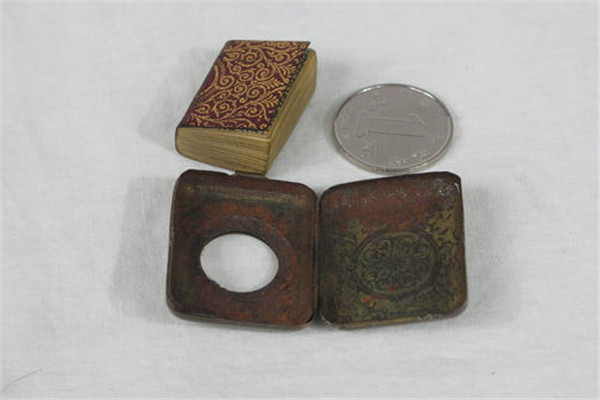 这本收藏在宁夏博物馆的《可兰经》长度为19.6毫米,宽为13.2毫米,厚6.1毫米,重量为1.1克。这本书被发现的时候,在一个精美的铁盒子里保存着,它的封面装饰是紫红色的硬牛皮纸,上面的印刻的有民族图案,同时阿拉伯文和埃及的国徽也在内封上排列着。这段阿拉伯文的大致意思是,这是一本非常珍贵的《可兰经》,只有心灵很纯净的人才能携带这本书,制造年份是在穆历13 12年,也就是公元1892年。