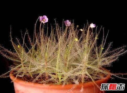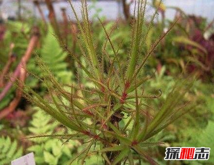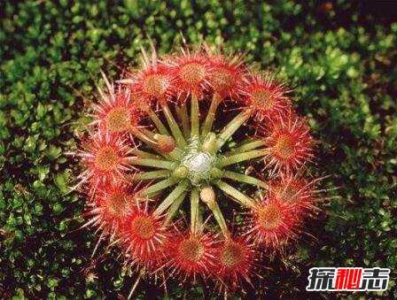 茅膏菜是食肉植物中最大的一类共有250个原生品种其中有80种左右为自然环境中产生的亚种、变种或者变型分布于世界各地,它的叶片密布着晶莹剔透的露珠光彩夺目,对猎物而言耀眼的光芒却是他们致命的武器,因为茅膏菜就是通过这些露珠来进行捕猎的。