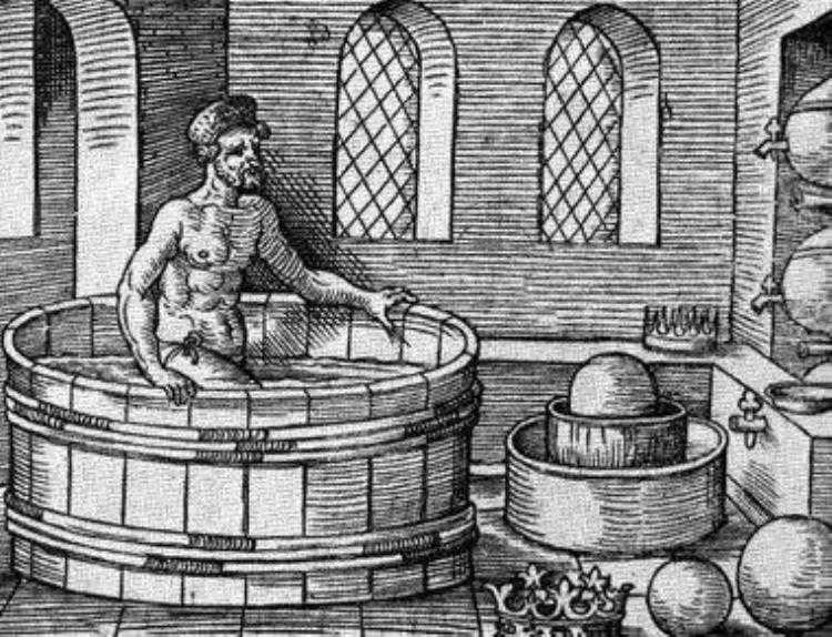 起初,阿基米德也想不出好办法。苦闷之际,他到公共浴室洗澡,当浸入放满水的木桶时,一部分水溢出桶外,他的身体顿觉轻飘,于是豁然开朗。阿基米德领悟到,不同质料的物体,虽然重量相同,但因为体积不同,排出的水量也必不相同。根据这一道理,不仅可以判断王冠是否掺假,还可以知道少去的黄金份量。