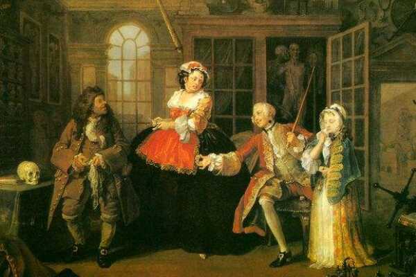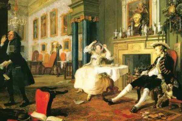 出身于英国的威廉·贺加斯就是世界上最早的漫画家,早在300年前,他就以一个老贵族和新资产阶级的联姻故事来创作了一个系列油画《时髦婚姻》,该作品一共有6幅画,主要就是运用了尖锐且辛辣的手法来表现当时上层阶级的阴暗面,讽刺当时的社会现象。