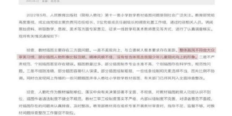教育部全力做好中小学教材教辅排查整改工作针对人民教育出版社小学数学教材插图问题,教育部高度重视,举一反三,部署对全国中小学教材教辅和进入校园课外读物的插图及内容进行了全面排查整改,确保体现正确的政治方向和价值导向,弘扬中华优秀文化,符合大众审美习惯。
