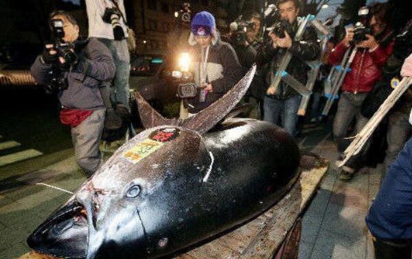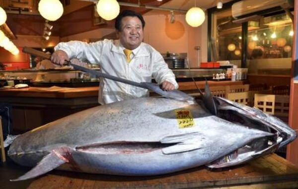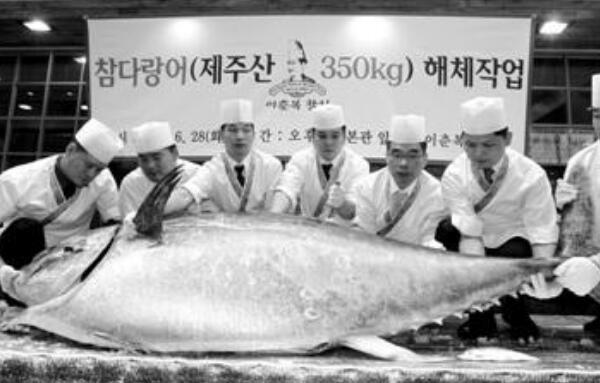 2011年6月28日,在韩国南部海域,一条巨型金枪鱼由一只缀满钩子的捕鱼器捕获,它长2.7米,重达700斤,是当时世界上最大的金枪鱼。这条巨型金枪鱼出售价格未被公开,但韩国首尔餐馆的厨师们分割了这条金枪鱼做菜。,所以当时韩国许多人吃过。
