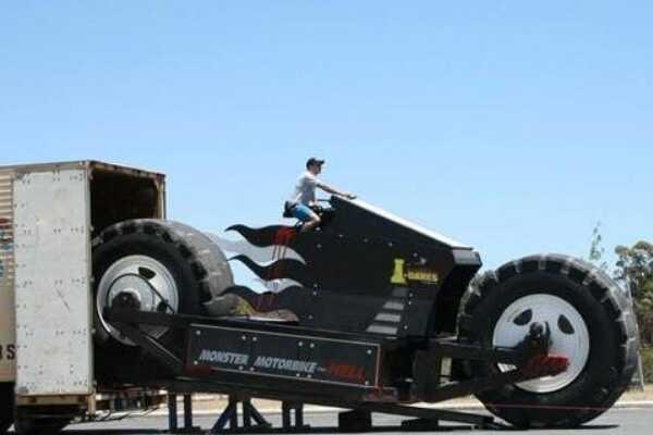 由澳洲人雷·鲍曼和他的团队设计制造的“摩托怪兽”就是目前世界上最高的摩托车,它足足有3.1米,几乎和一辆中型载货卡车的高度不相上下,而当人坐在上面驾驶的时候,就像是骑到了一头大象的头上,一个成年男人的身高还不如它的一个车轮高。