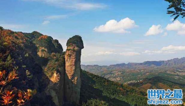 这是石笋峰,金鸡独立于悬崖峭壁边,像一根刚出林的竹笋。竹笋峰高达数十丈,通体不长一草一木,尖顶上,却生长着一丛茂盛的灌木,因此竹笋峰又像一名怒发冲冠的卫士日夜守护着剑门雄关。