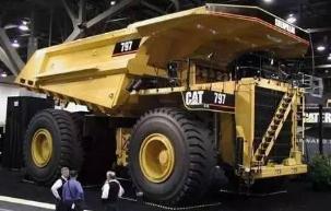 卡特797是全球最大的工程机械和矿山设备,这款车在1998年推出的时候,就以326吨的额定载重量成为了当时最大的卡车。在2002年的时候,升级版的卡特797B一345吨的额定载重量,成为当之无愧的工程机械巨无霸。这个超大型的卡车,有着一些超大型的车轮。