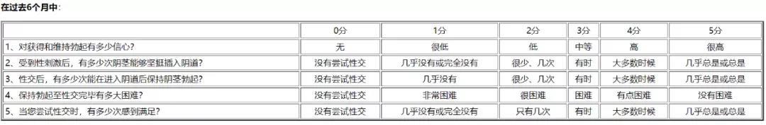 IIEF-5是着名的勃起功能国际问答卷的简称,它是为了便于门诊患者陈述在过去6个月中,勃起功能障碍是否严重,以及方便患者与医师间沟通的一份问答卷。