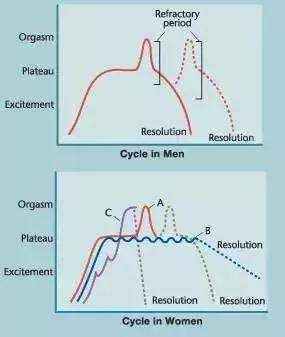 在上个世纪50-60年代,两个勇敢的先锋,美国马斯特斯和约翰逊夫妇进行了大量的科学研究,提出了在一次爬山行为中(不论是自己和两个人),身体的反应有四个时期:热身、平台、巅峰和消退。(为了安全,我用爬山来比喻,略有修改)