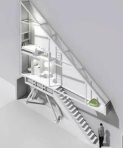 房子一层是厕所和浴室,里面放置了马桶和一个淋浴喷头。在二楼则是卧室,摆放了一张床和一张与墙壁相连接的书桌,甚至在床头上还有一个天窗,因为整座房子是用半透明材料做成的,白天的时候光线十分的不错,床头的迷你壁龛里放着几本书,窝在床头上看书也是十分的惬意。房子的三楼就是厨房了,虽然没有锅灶等厨具,但是橱柜和冰箱还是有的。房子里面厨房、卧室、卫生间等等一应俱全,甚至它的主人还放了个洗衣机在里面。