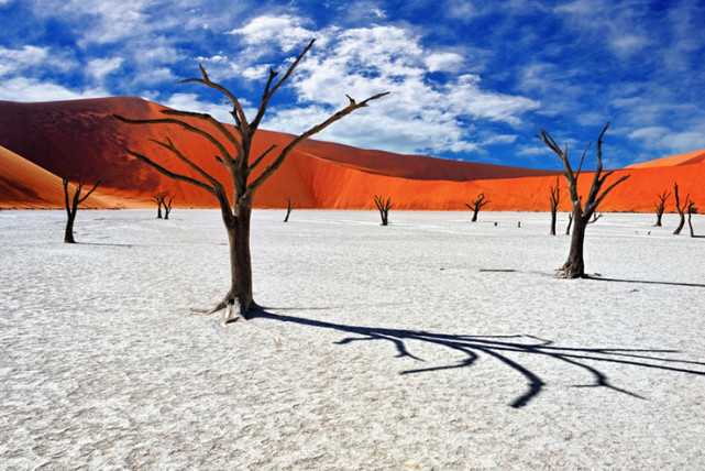 您可能没有听说过Sossusvlei,但是在电影中常常可以看到其标志性的风景。它位于纳米比亚沙漠南部的纳米比亚,那里是干燥的湖泊,粘土盘以及橙色和红色沙丘的区域。它的名称结合了南非荷兰语单词“ vlei”(意为“沼泽”)和本地纳马语单词(意为“不归还”)。该地区拥有极为空旷,干净的美景,沉没的金合欢树,深蓝色的天空,以及不断变化的,发亮的沙滩红色,营造出迷人的景色。