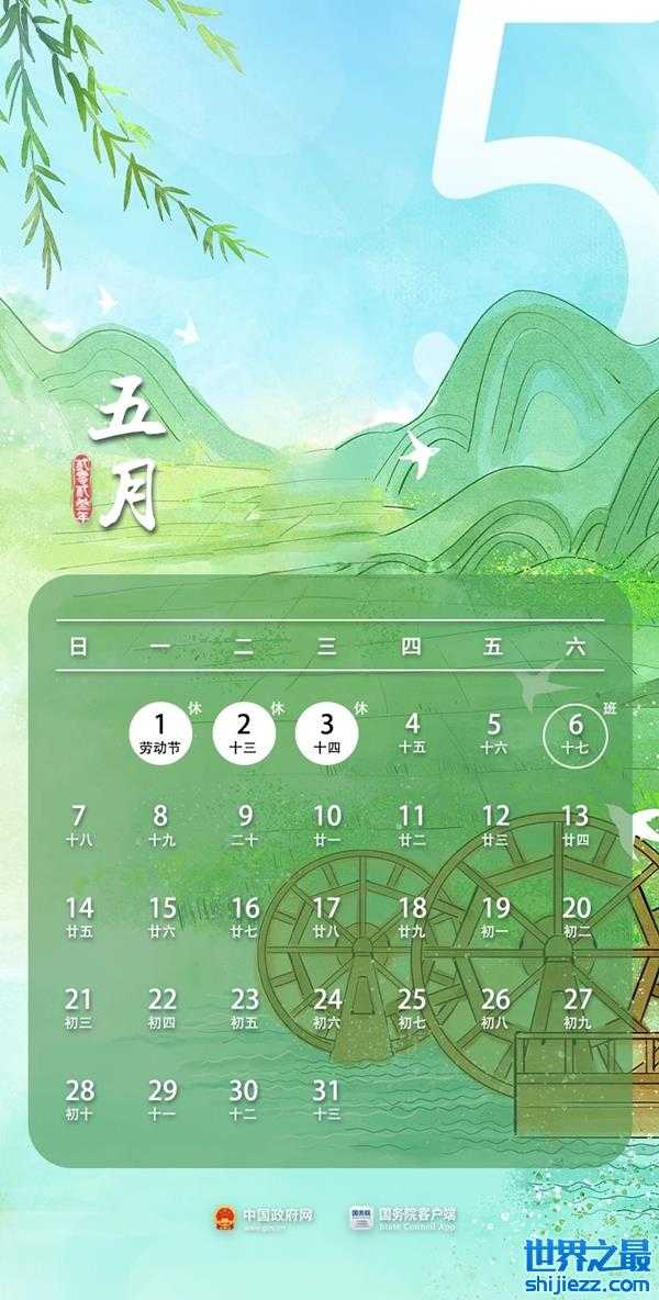 劳动节:4月29日至5月3日放假调休,共5天。4月23日(星期日)、5月6日(星期六)上班。