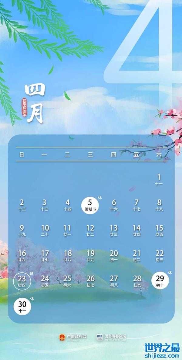 4月29日至5月3日放假调休,共5天。4月23日(星期日)、5月6日(星期六)上班。
