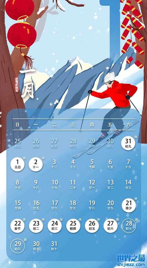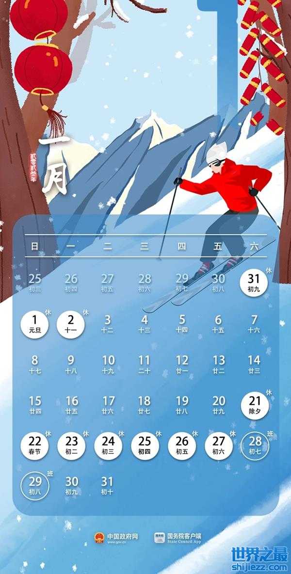 1月21日至27日放假调休,共7天。1月28日(星期六)、1月29日(星期日)上班。