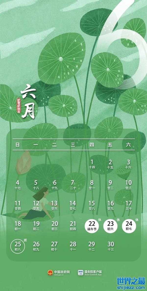 端午节:6月22日至24日放假调休,共3天。6月25日(星期日)上班。