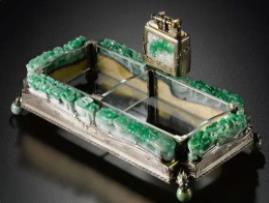 这款叫做“Jadeite Ashtray and Lighter”的打火机最大的特点就是融合了打火机和烟灰缸两个物品的功能,在烟灰缸的中央设置了精美的银饰打火机架,虽然这款打火机是由美国纽约的爱德华·法默手工制作的,但是却带有非常强烈的东方古典美,尤其是翡翠的部分都雕刻着非常华美的柿子浮雕。