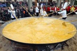 世界上最大的煎蛋就诞生于法国的Haux小城之中,据说在2014年的复活节到来时,当地的民众就聚集在一起制作出了这个世界上最大的煎蛋,整整使用了5214个鸡蛋才顺利的完成了挑战,最终有七百名民众一起享用这个超大号煎蛋。