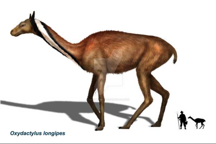 在这诸多驼类当中,尖趾驼(Oxydactylus)似乎预判未来的演化趋势,率先演化出了长颈部,试图采食高处的植物,不与其它食草动物在低处无效内卷。只可惜碍于娇小的身形,哪怕脖子伸直,高度也不超过一个成年人的身高,可谓心有余而力不足。